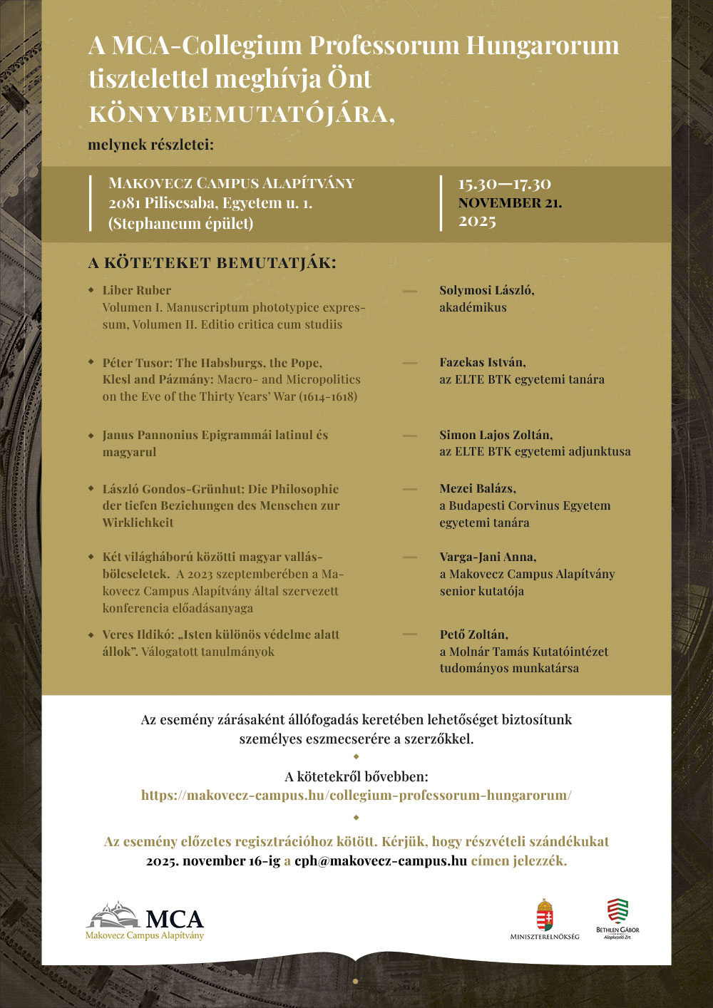 Könyvbemutatót szervez a Collegium Professorum Hungarorum a könyvsorozatában megjelent kötetekről. Az esemény részletei a plakáton olvashatók.